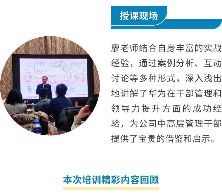 本次培訓有幸邀請到原華為公司流程管理變革及組織績效提升專家廖維老師。廖老師憑借深厚專業(yè)知識與豐富實戰(zhàn)經(jīng)驗,培訓內容圍繞“領導力提升”和“干部管理”兩大主題展開,涵蓋了領導力發(fā)展歷程、華為領導力實踐經(jīng)驗、自我批判方法論、解決復雜問題能力、干部的使命和責任、以奮斗者為本的干部管理等多個方面。